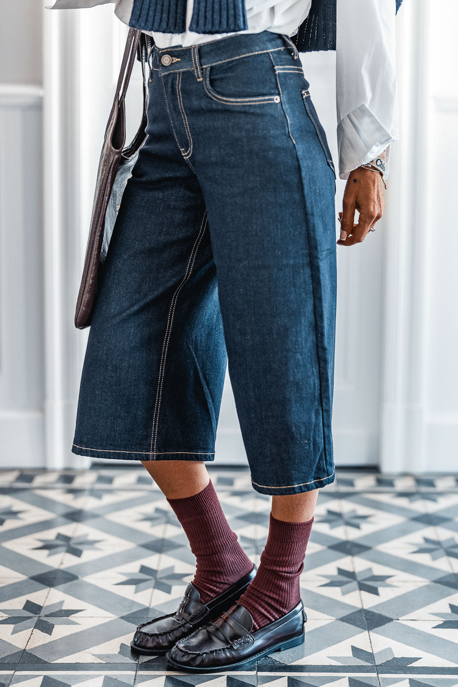 The Camici raw denim bermuda shorts are a key piece this season, with their long shorts style, straight silhouette, and ultra-trendy knee-length hem. Grungemama has embraced the style.