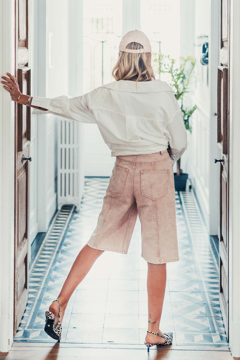 This season's must-have piece is the Ruben pink Bermuda shorts, made of denim with a long shorts style, straight silhouette, and ultra-trendy knee length. The style has been adopted by Grungemama.