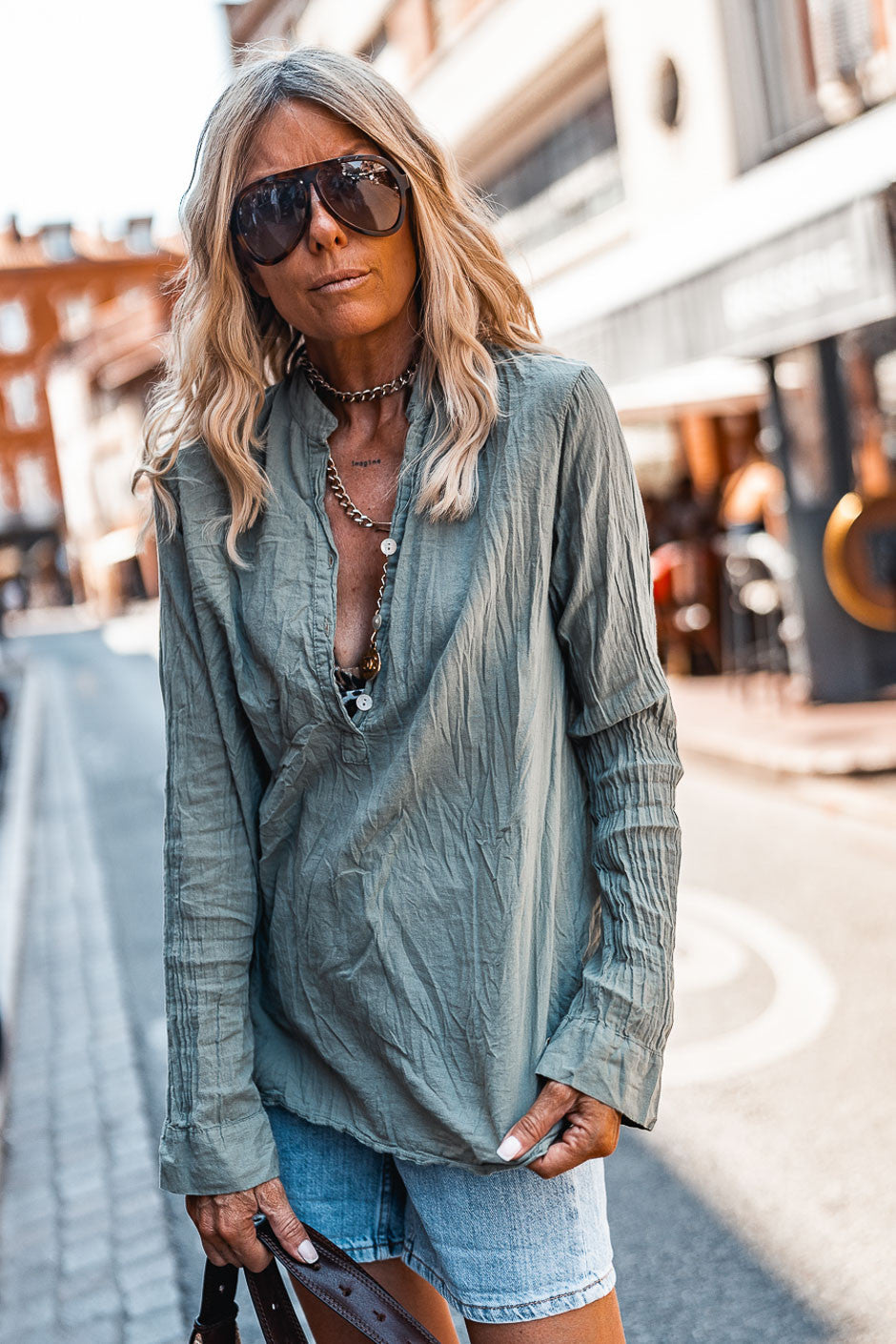 Timeless and essential, the army green Kovan blouse embodies the Grungemama DNA. We love its minimalist style that suits all body types, season after season.