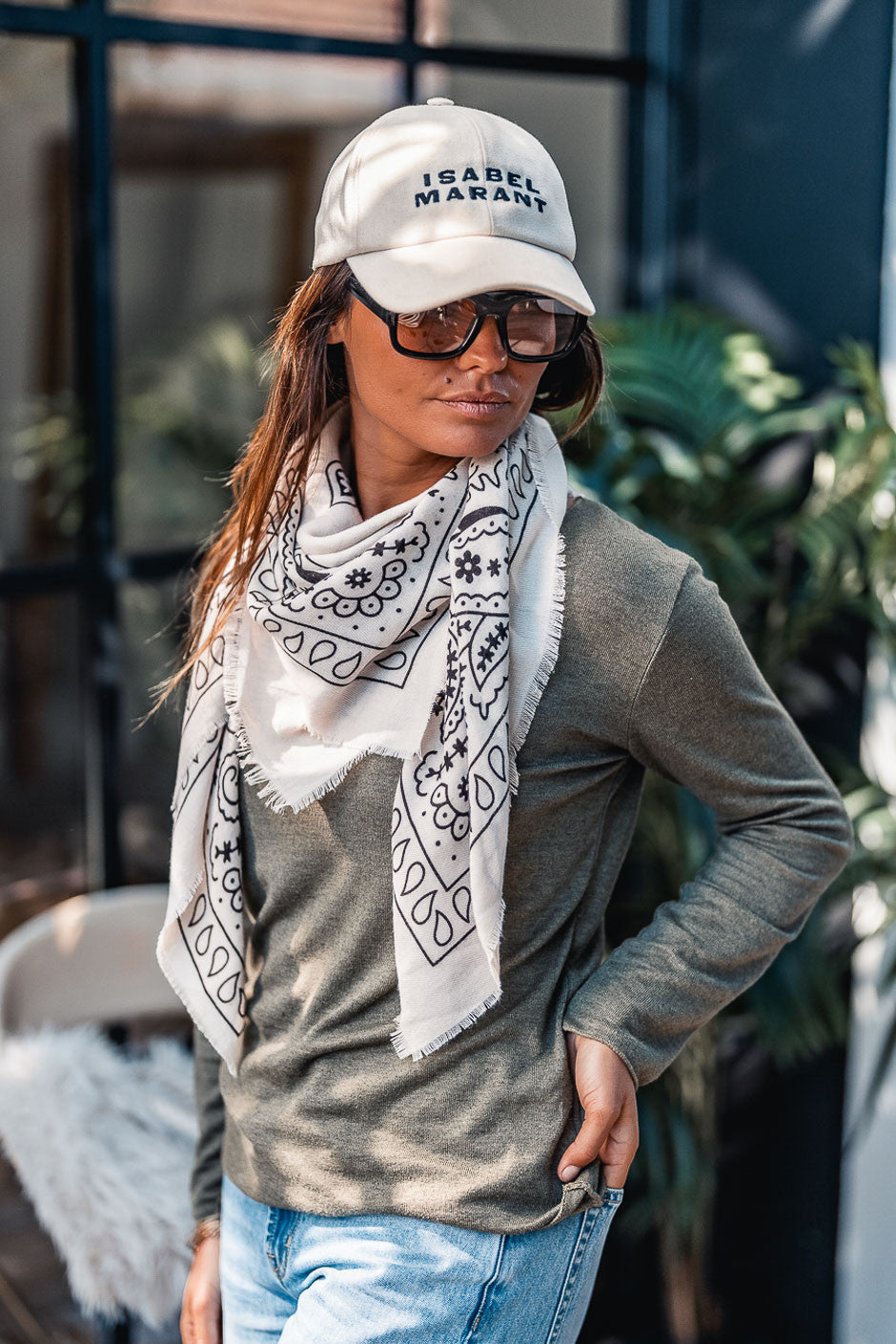 We love the rebellious, rock 'n' roll vibe of this large ecru Joey scarf. With its bold, paisley-inspired patterns, it's right on trend this winter. We can't live without it at Grungemama.