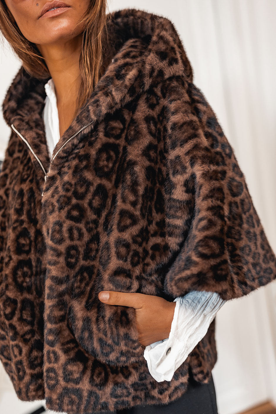 The Alizée Fur by Grungemama comes in a bold and ultra-chic leopard print. This cape-style cape with its enveloping hood combines style and comfort. It's the essential Grungemama piece for a wild yet sophisticated look—we love it!