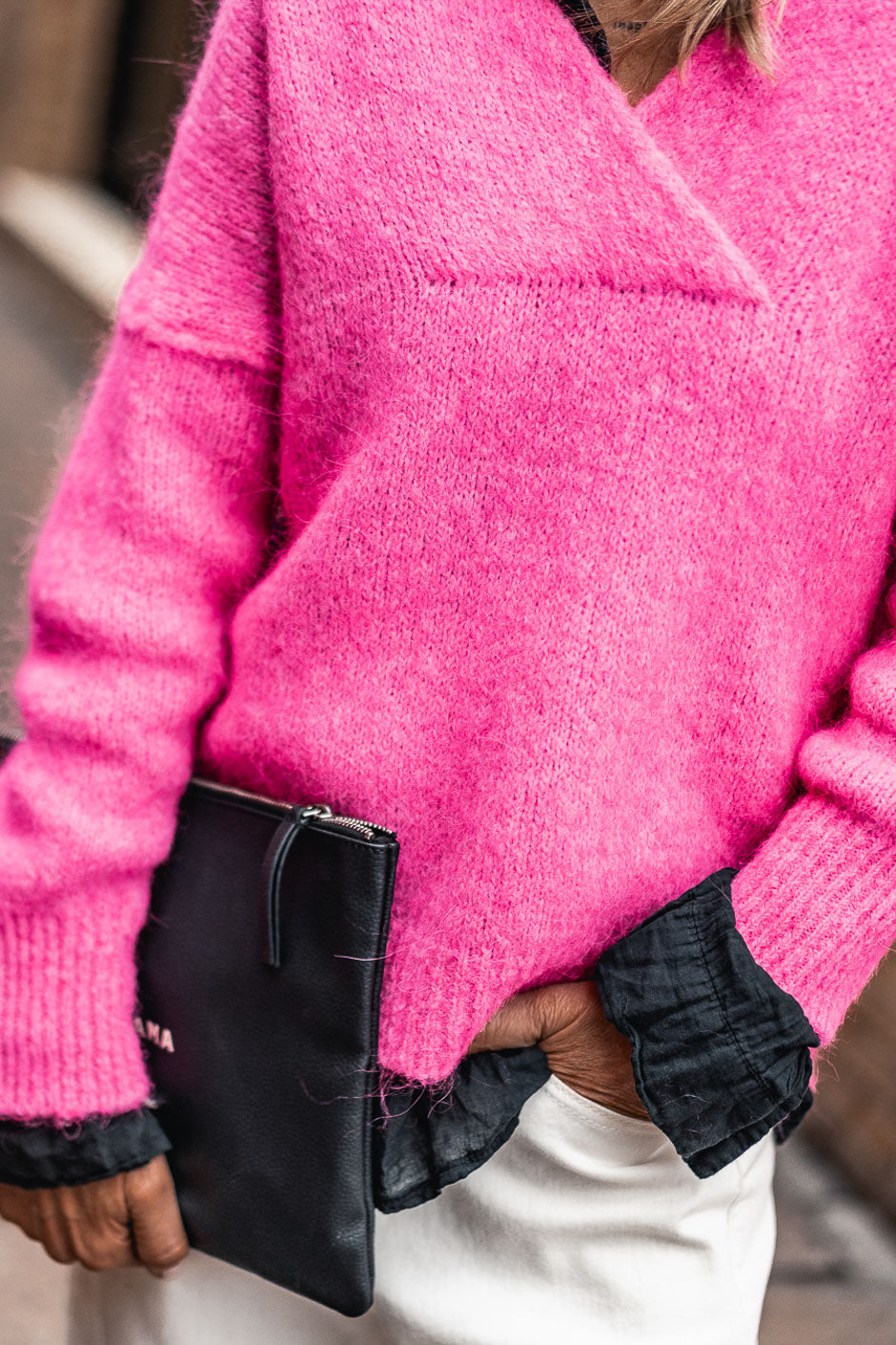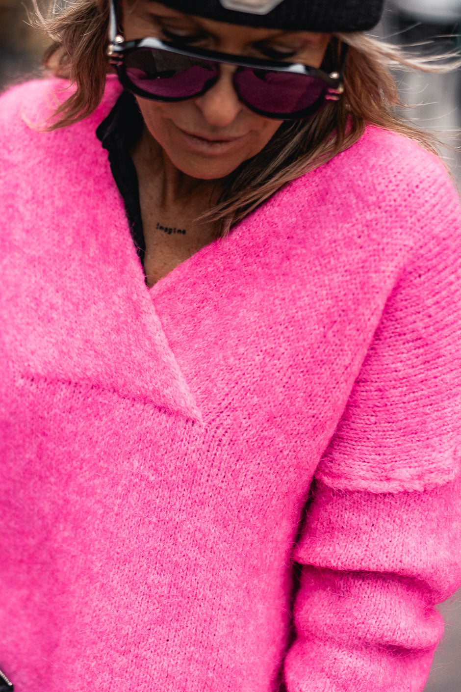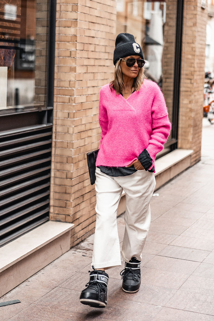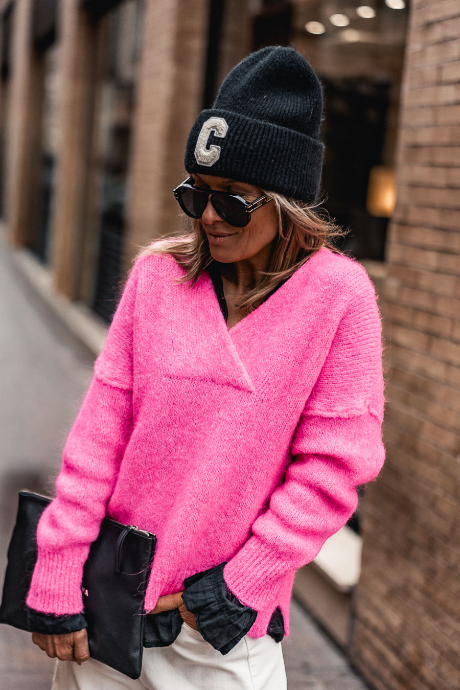 Grungemama is embracing pink with the Ezra sweater by Banditas in a super soft knit. A color that will brighten up your wardrobe this winter while looking incredibly stylish.