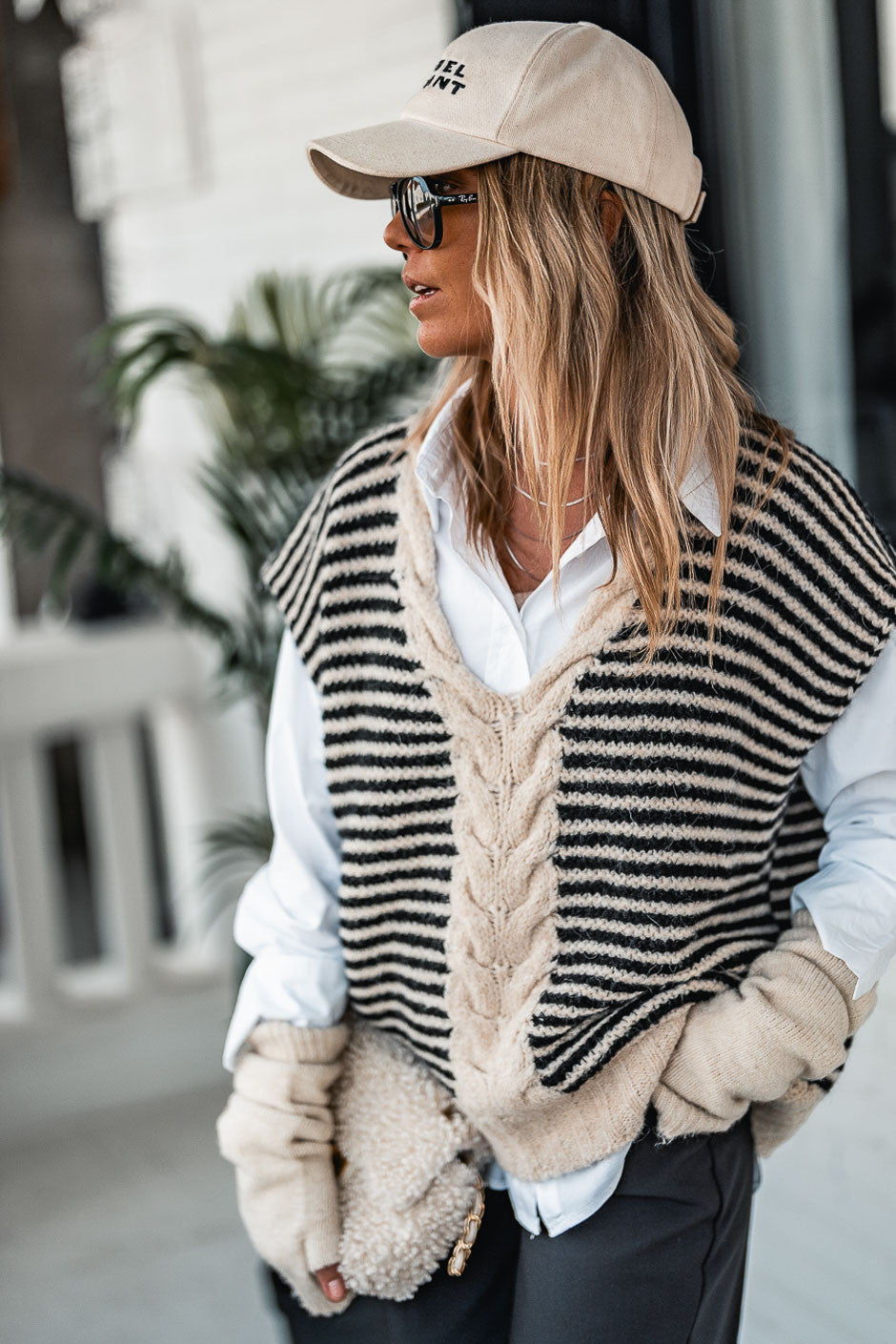 The Nash sleeveless sweater from Banditas is appealing thanks to its casual and feminine style, perfect for layering. Its knitted stripes and warm, cozy fabric make it ideal for a trendy and comfortable look.