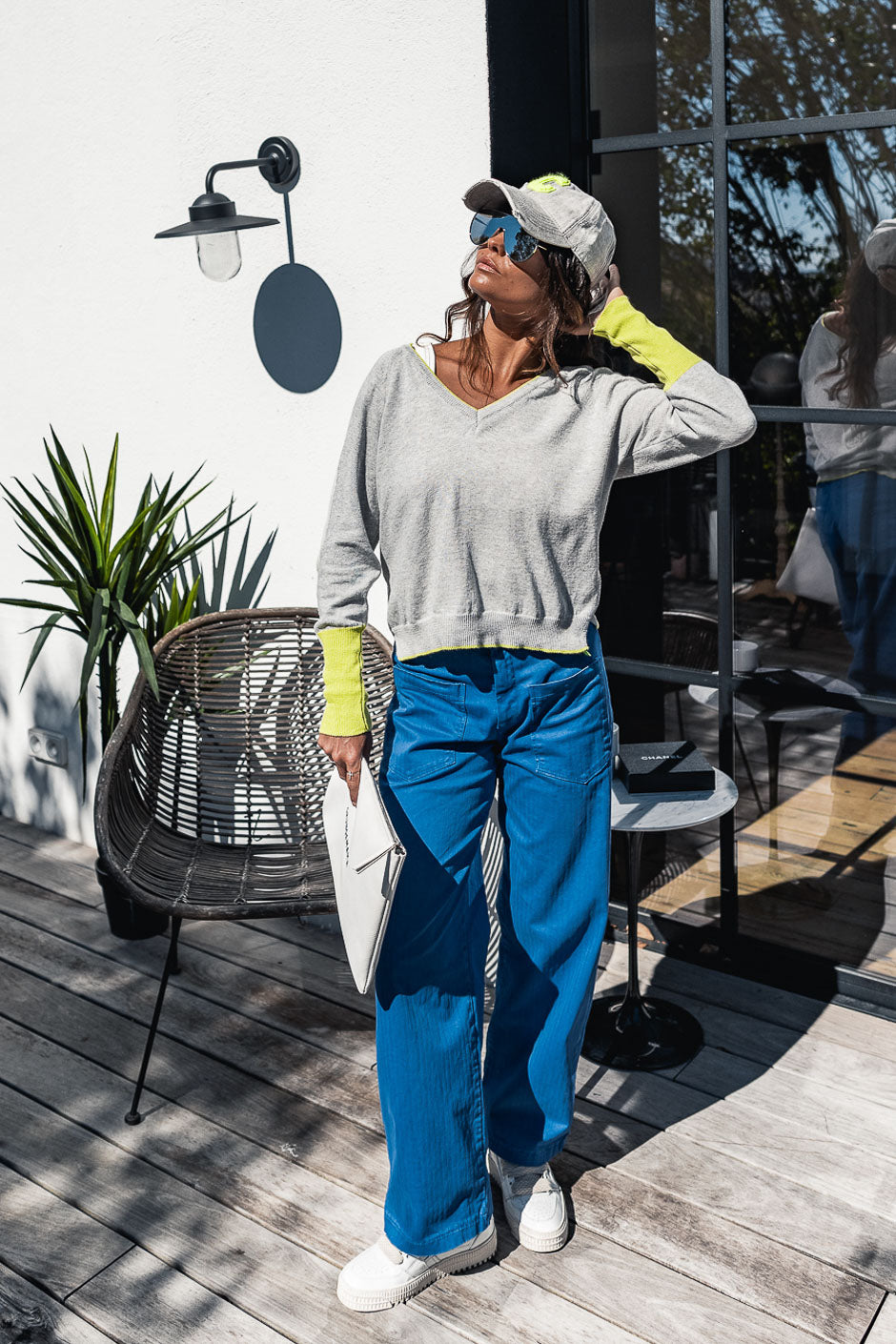Lyam, a Banditas sweater from Marseille with an elegant V-neck, made from fine knit. We love its tricolor gray, white, and aniseed color scheme for a fresh and original touch.