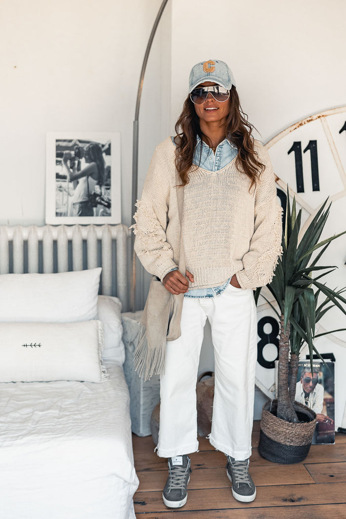 The Nitya beige sweater by Banditas is a Grungemama essential: lightweight, bohemian, perfect with jeans or shorts.