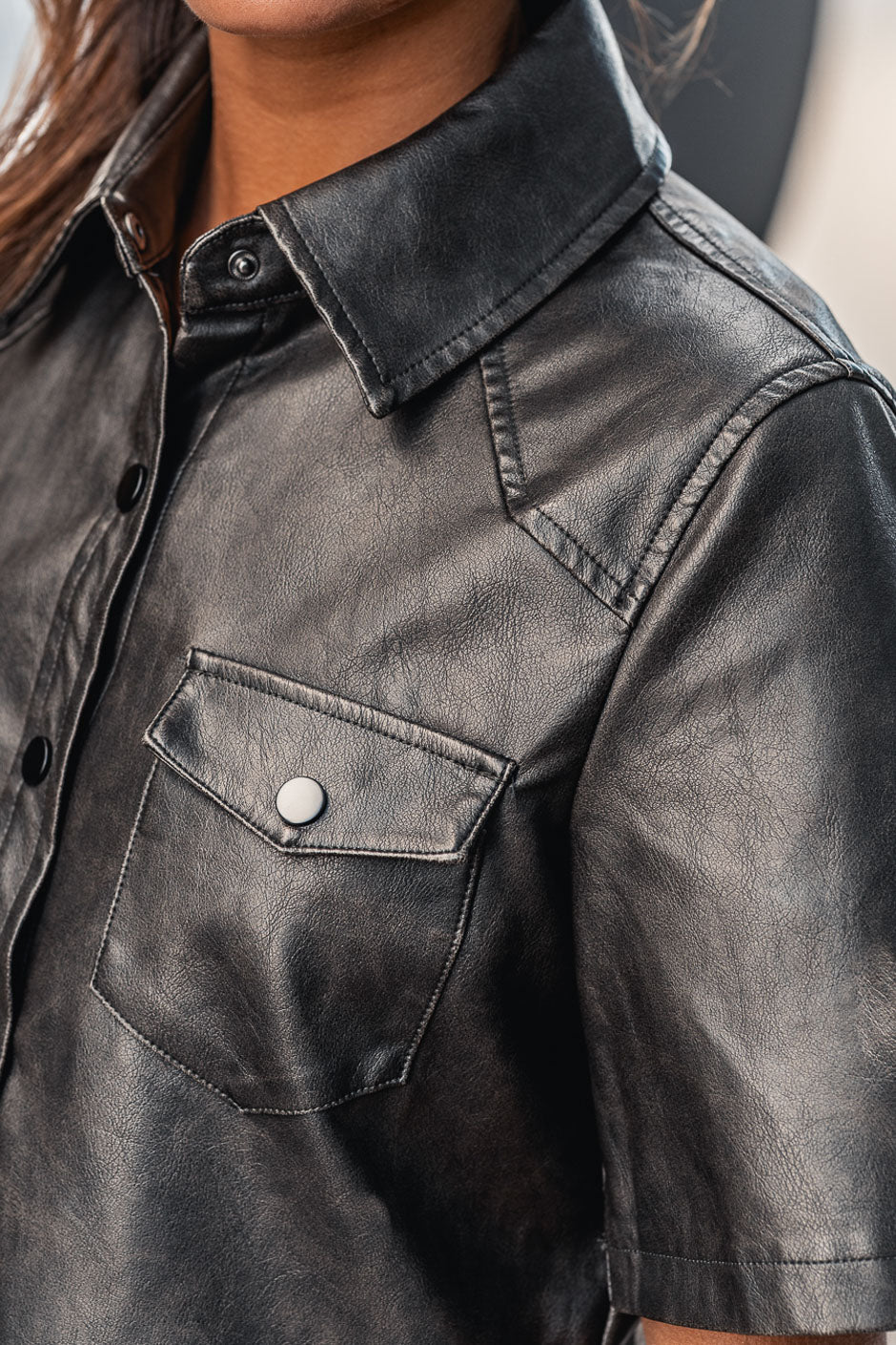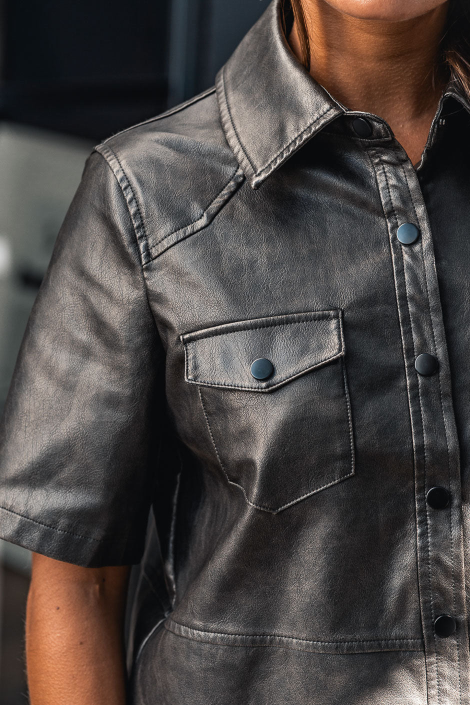 The Abby dress in distressed black faux leather will win you over with its decidedly feminine style. With its short sleeves, snap buttons, and aged leather-effect fabric, it perfectly embodies a glam/rock look with a preppy touch. A modern and daring piece that we love at Grungemama!
