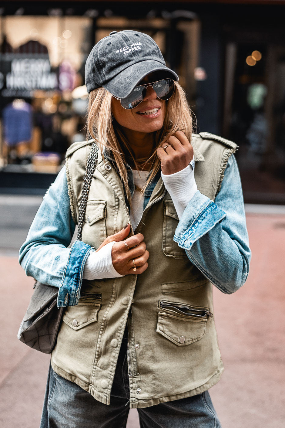 The iconic Grungeclub safari jacket returns in a "grungy" version: sleeveless, with raw, frayed edges in khaki canvas. Comfort, attitude, and the signature Grunge Club black rhinestone print... the perfect combination! It elevates your looks, summer or winter, with a confidently chic, adventurous vibe.