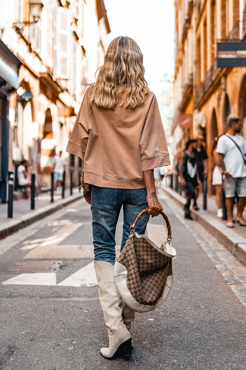 The Armstrong peach sweatshirt, in a soft, natural shade, is Grungemama's must-have casual piece for back-to-school. Comfortable and easy to style, we love it here with the blue Braxton jeans.