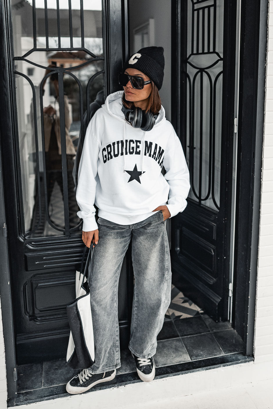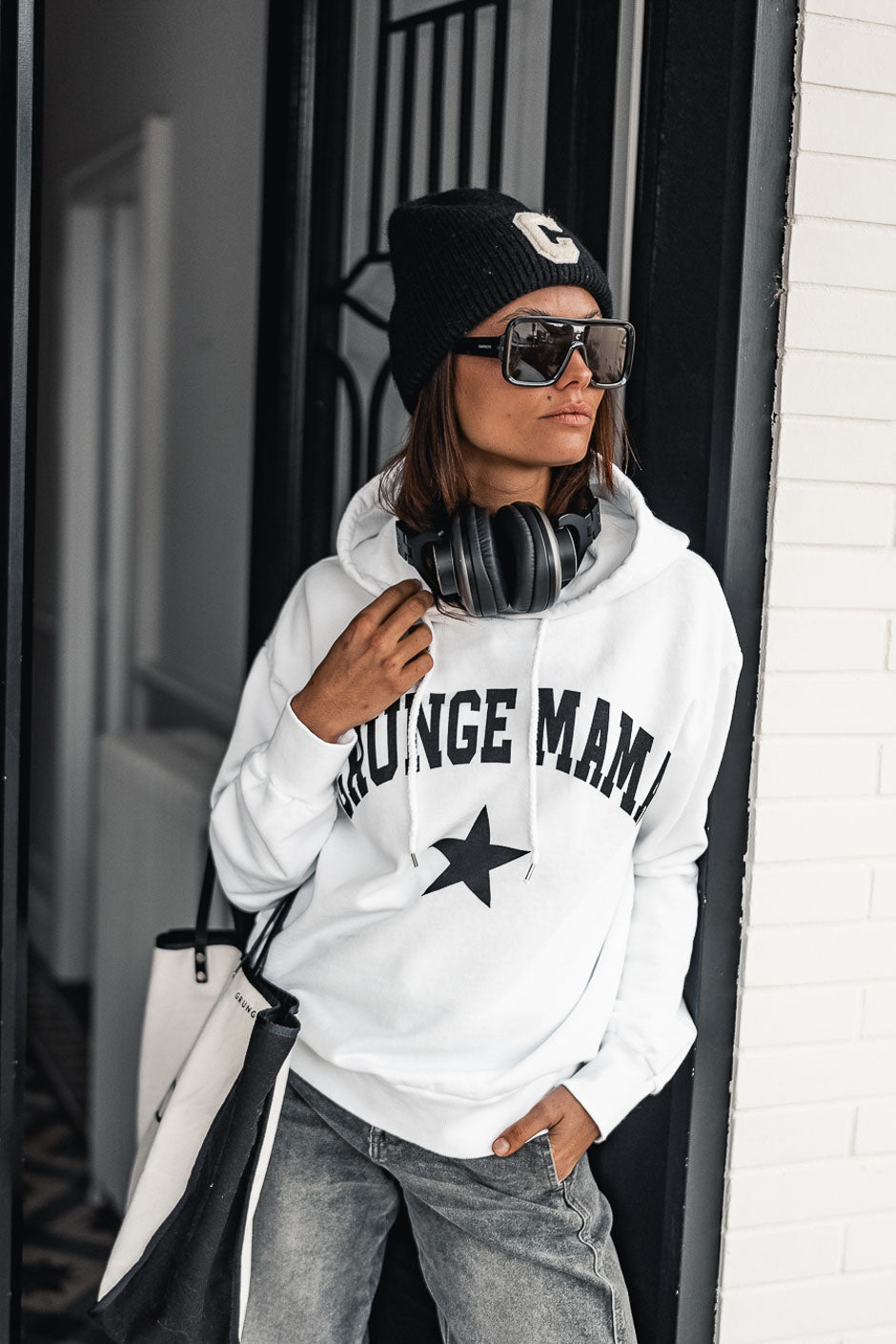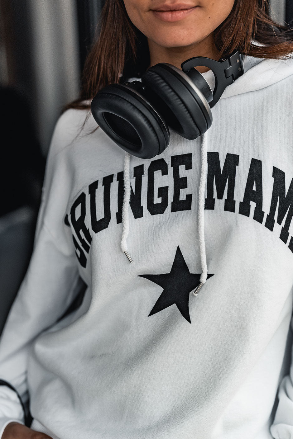 The Grungemama sweatshirt with its signature print offers a sporty vibe with its wrap-around hood and ultimate comfort. Wear it with jeans for a casual and trendy look. We love it.