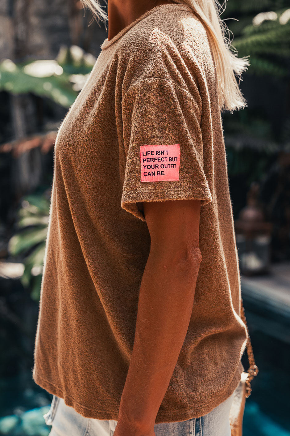 The Carlo T-shirt, made from ultra-soft terry cloth, is a blend of comfort and style. Its relaxed fit and classic crew neck make it suitable for all your summer looks. Wear it with the matching shorts for a beach outfit or, as shown here, with the Julia bleach skirt by Grungemama.