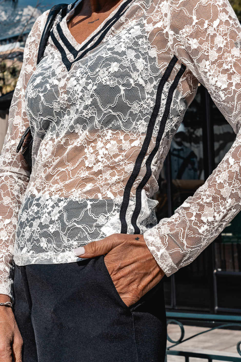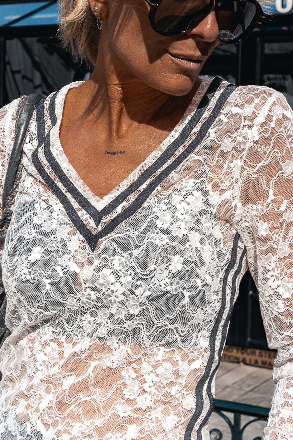 The Lou white lace top, enhanced by contrasting bands, is a blend of femininity and modernity. Wear it with jeans or smart black shorts for an easy and stylish look. Grungemama gives it a thumbs up.