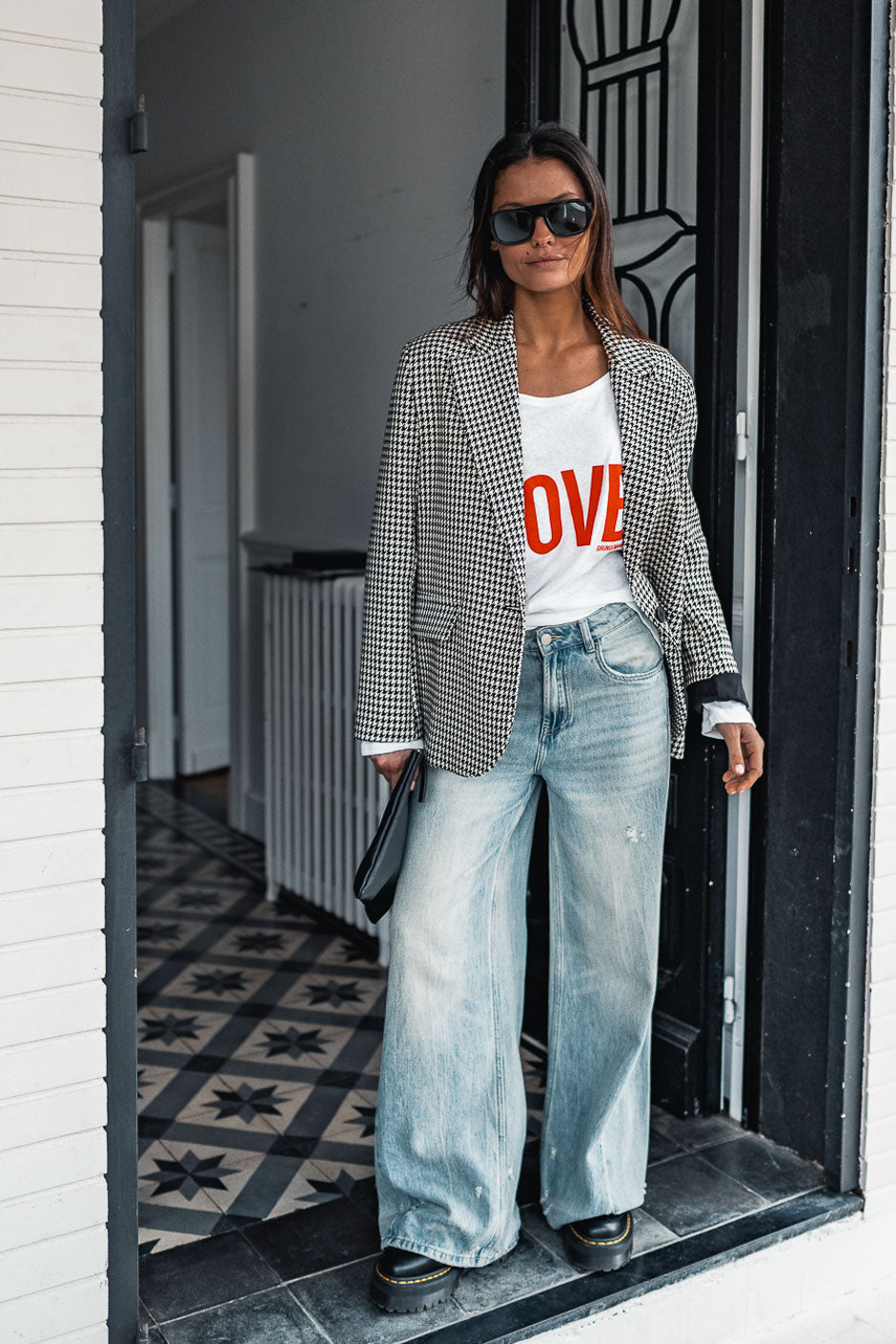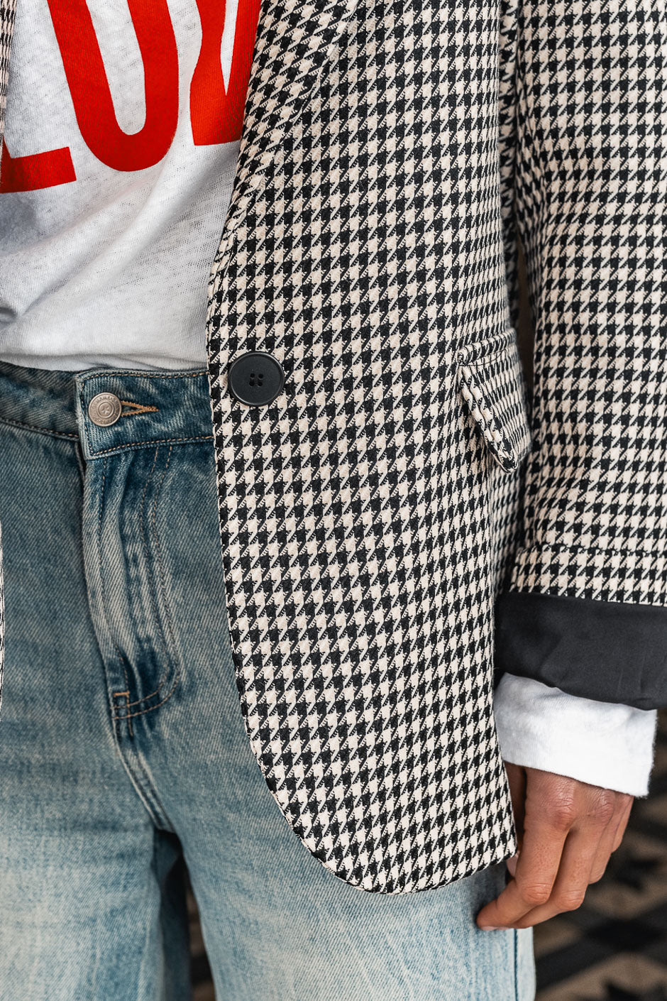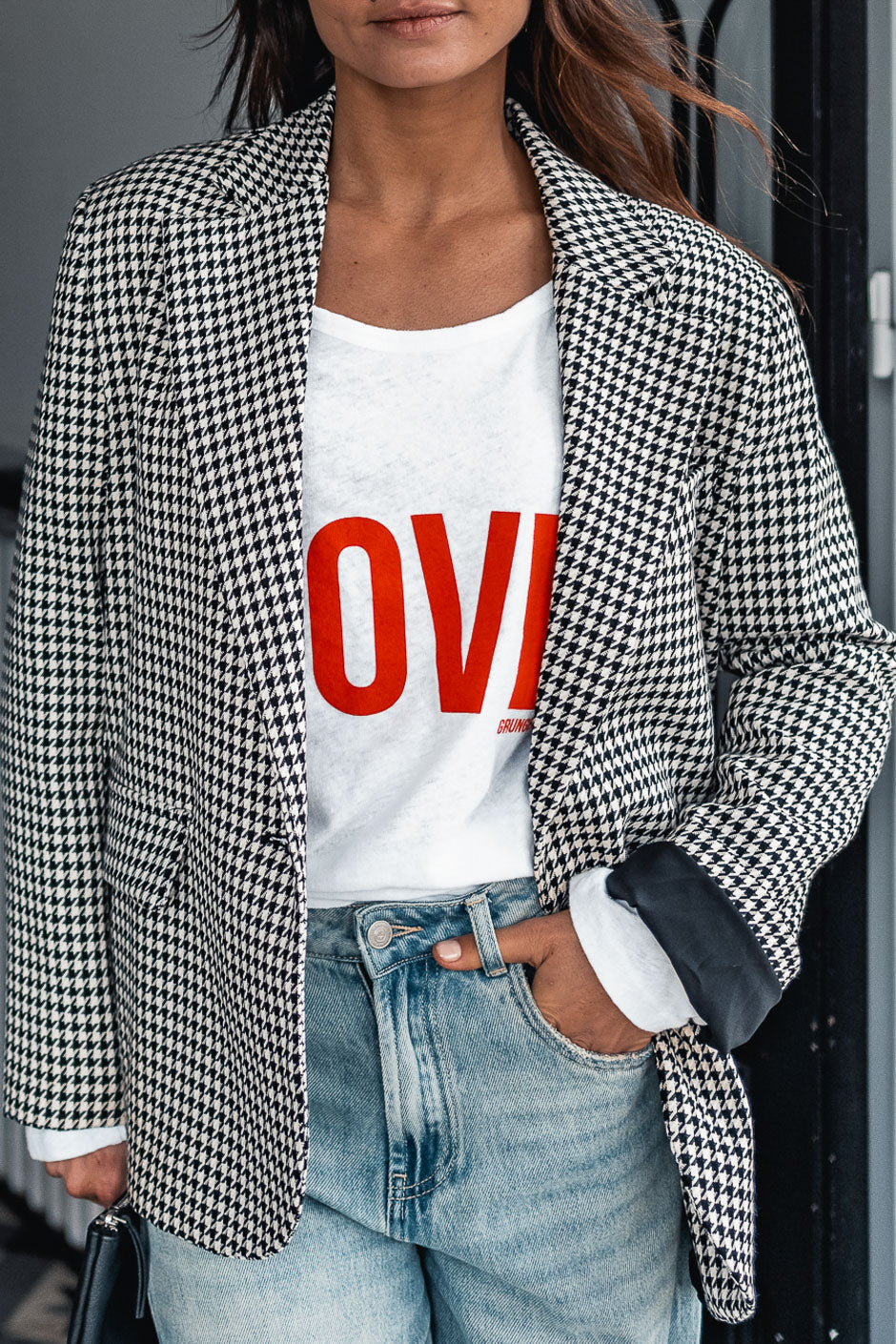 The timeless houndstooth pattern is reinvented at Grungemama: discover the Maina jacket, the perfect balance between classic chic and rock style.