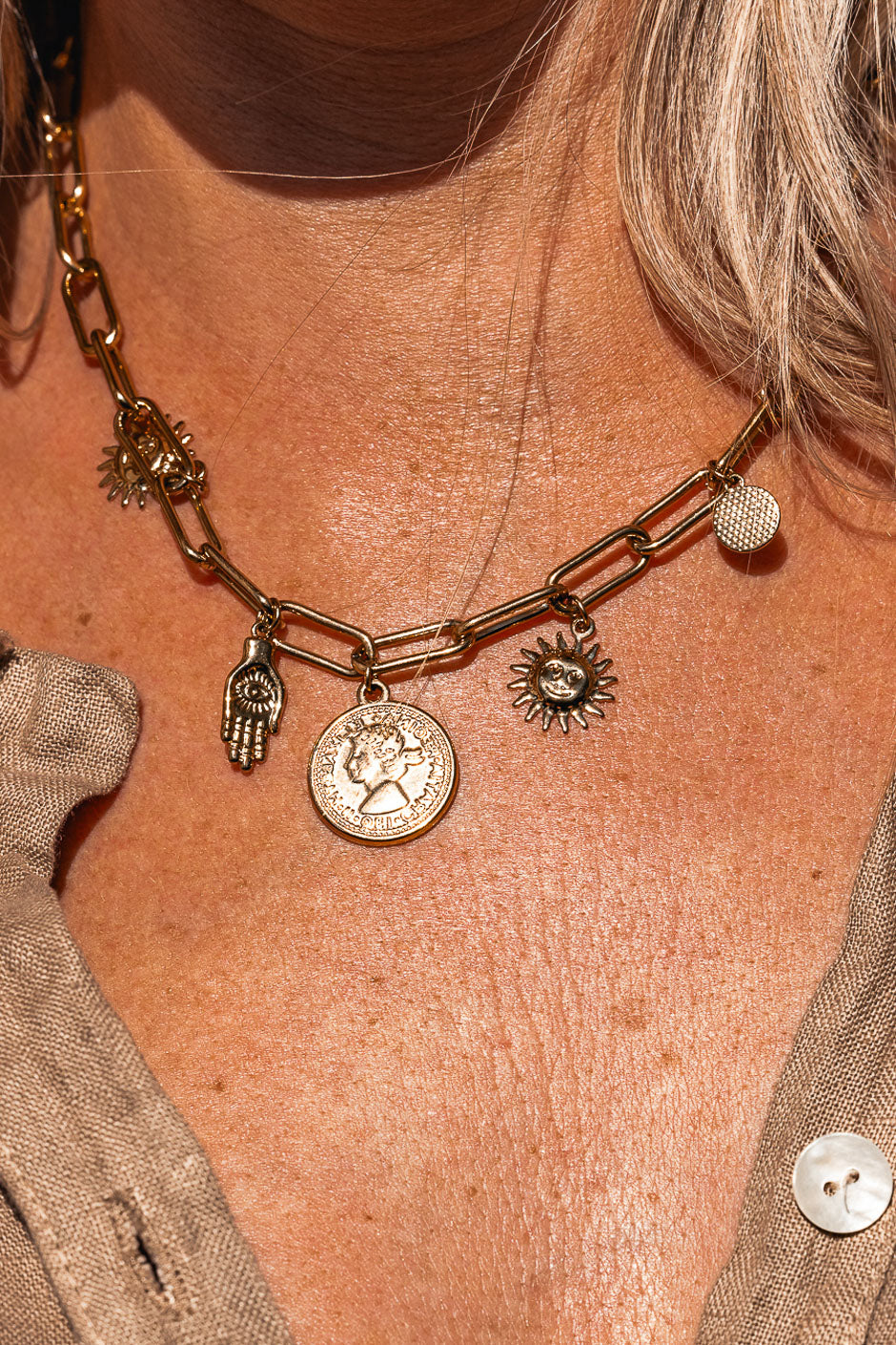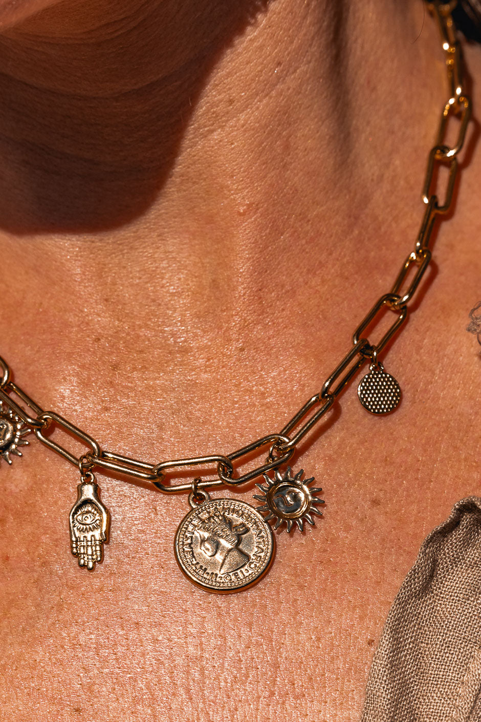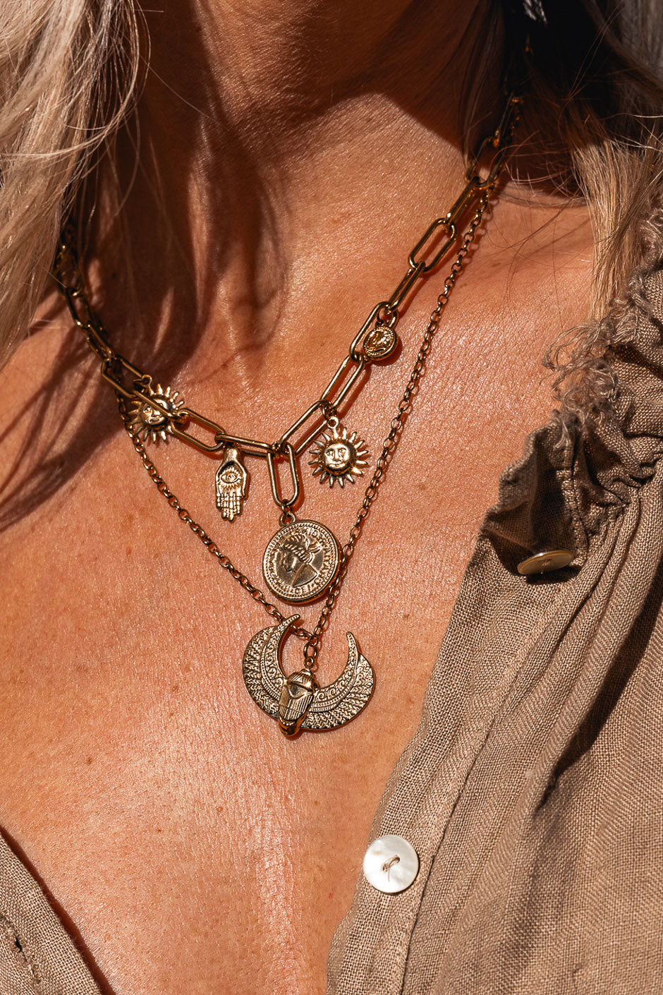 LIORA un collar dorado que huele a verano y a sol, adornado con dijes de la suerte para realzar tu escote.