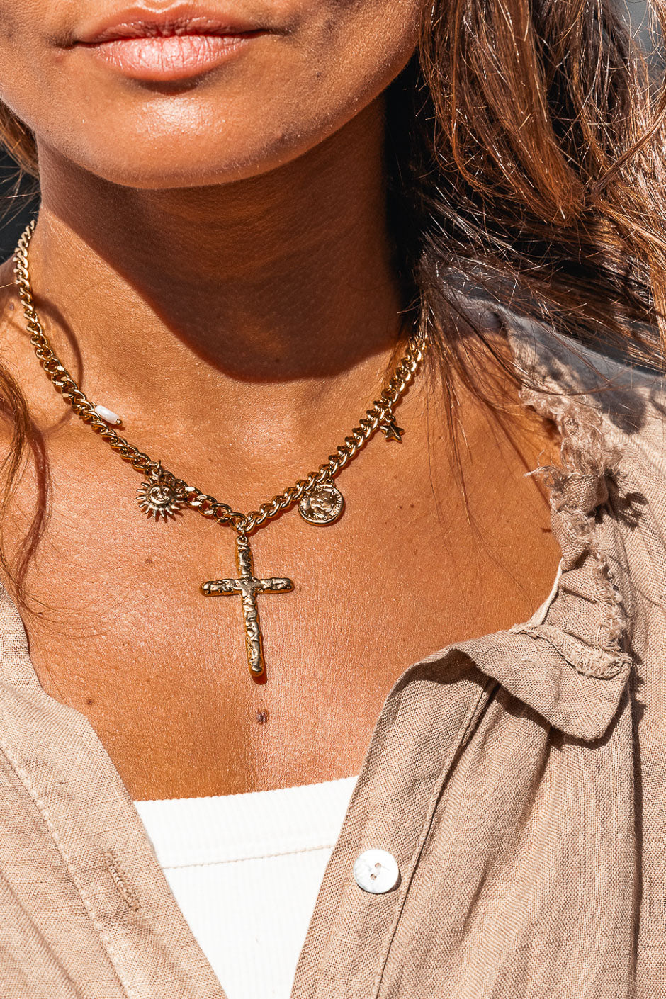Pensamos en el verano con el collar Veda boho/rock texturizado, con un atrevido colgante de cruz, para combinar con todos los collares, el look es increíble.