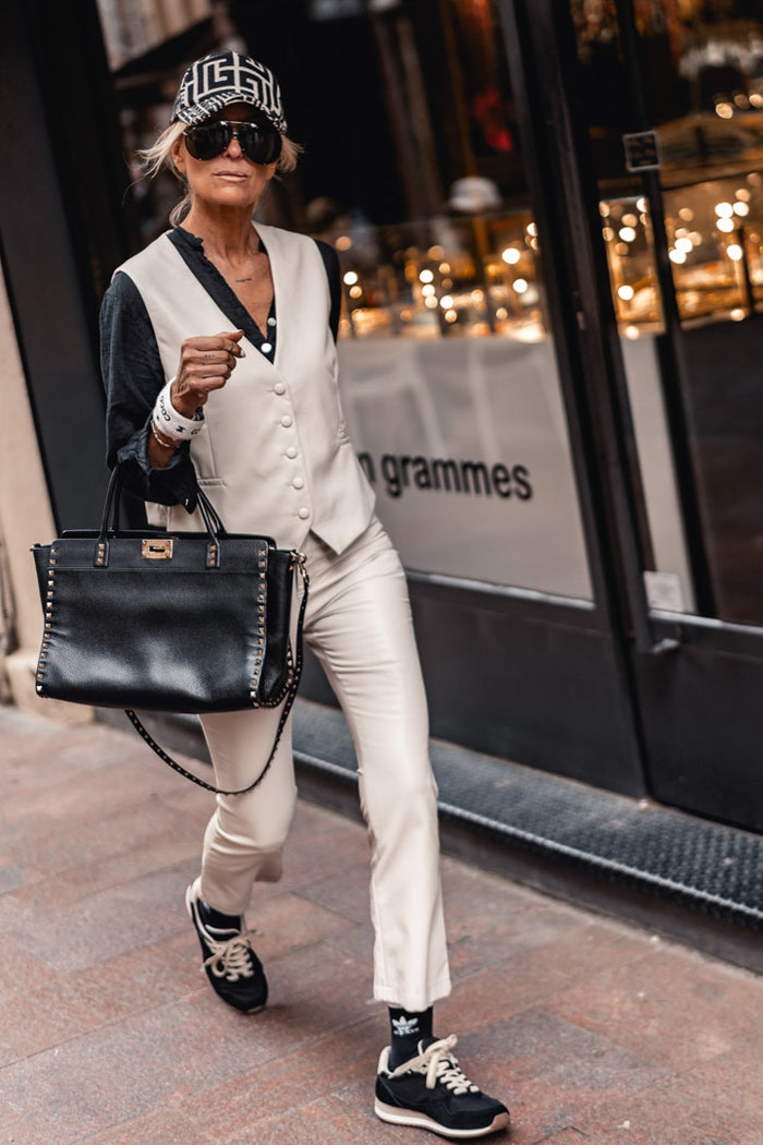 El chaleco Delia de piel sintética color crudo de Grungemama combina modernidad y carácter gracias a su material efecto piel y su corte contemporáneo. Llévalo solo o con los pantalones Delia; le dará un toque chic y decidido a cualquier look.