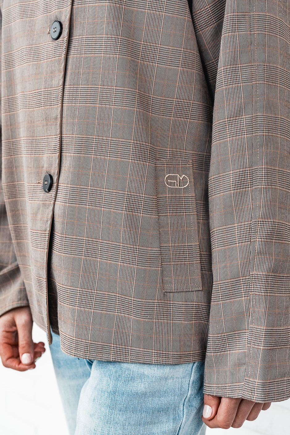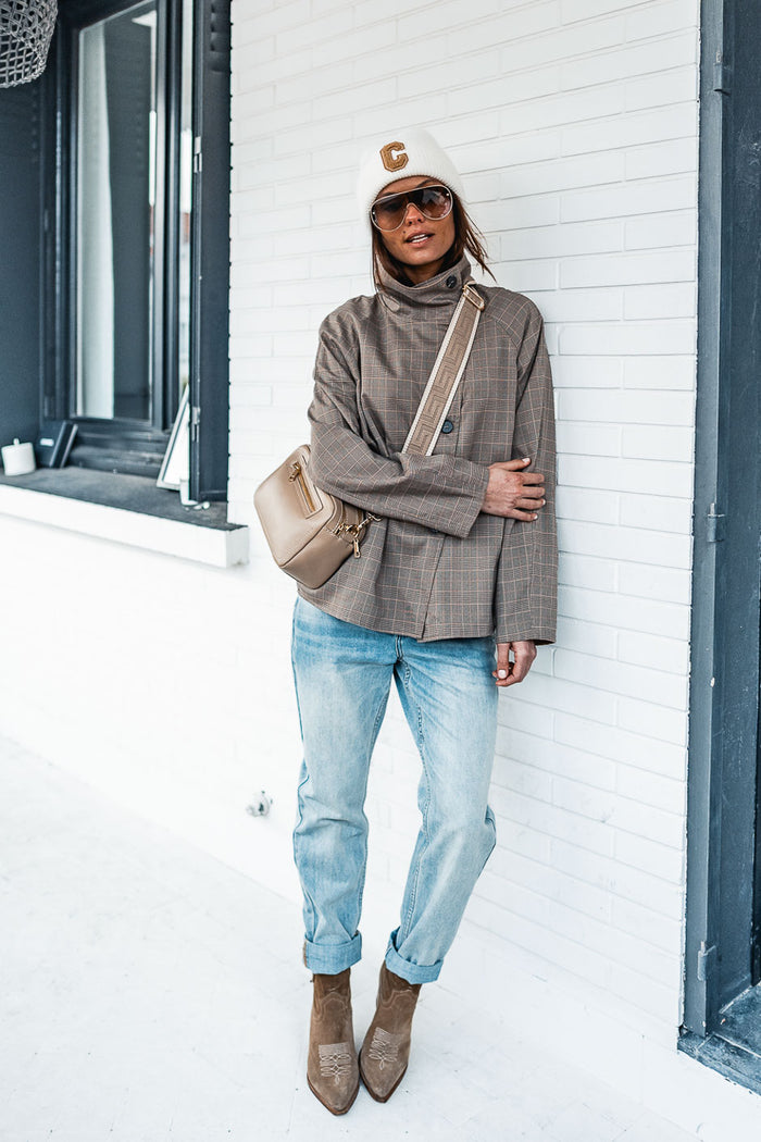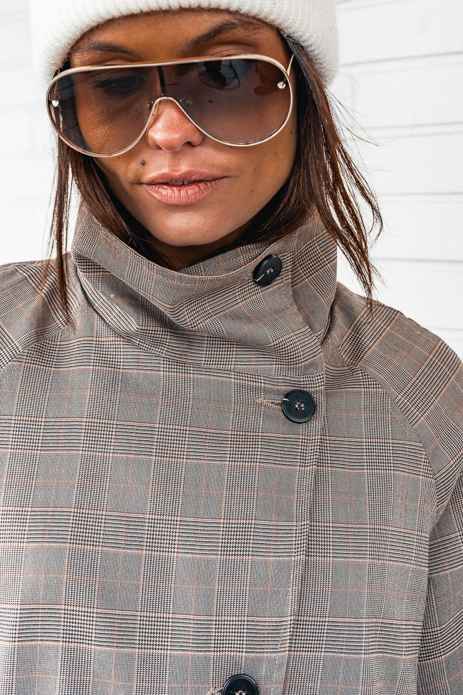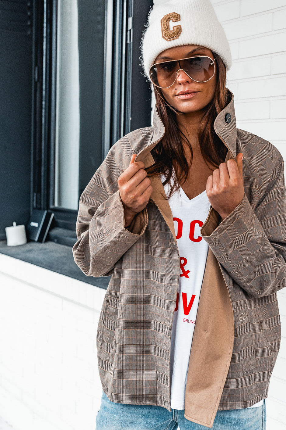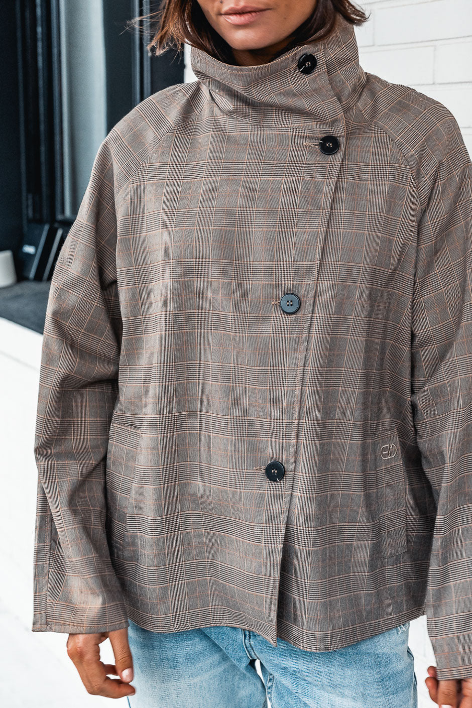 Nos encanta el estilo grunge chic de esta chaqueta de cuadros Príncipe de Gales de Grungemama. Con su moderno corte oversize y cuello alto, es perfecta para el entretiempo.