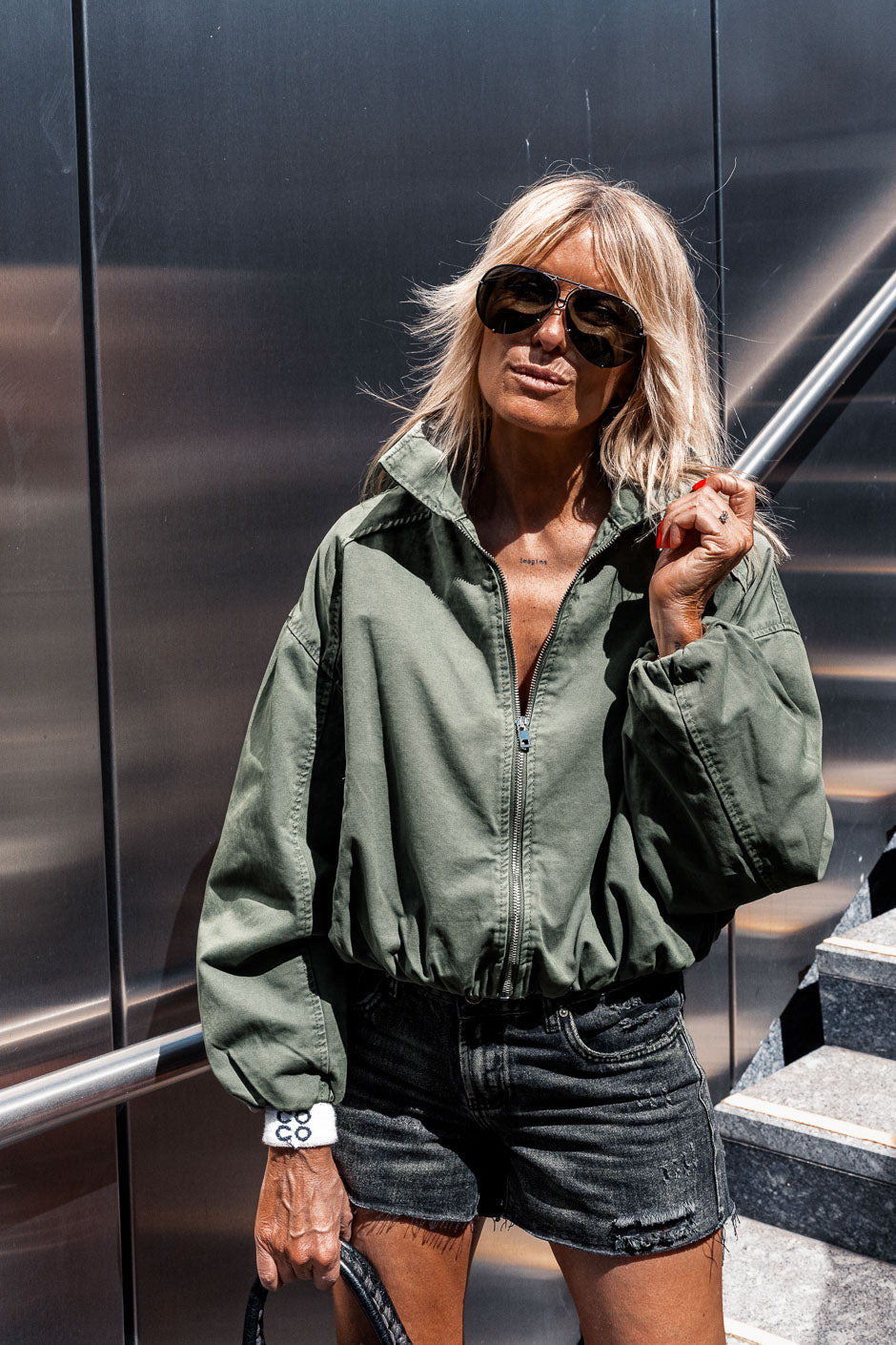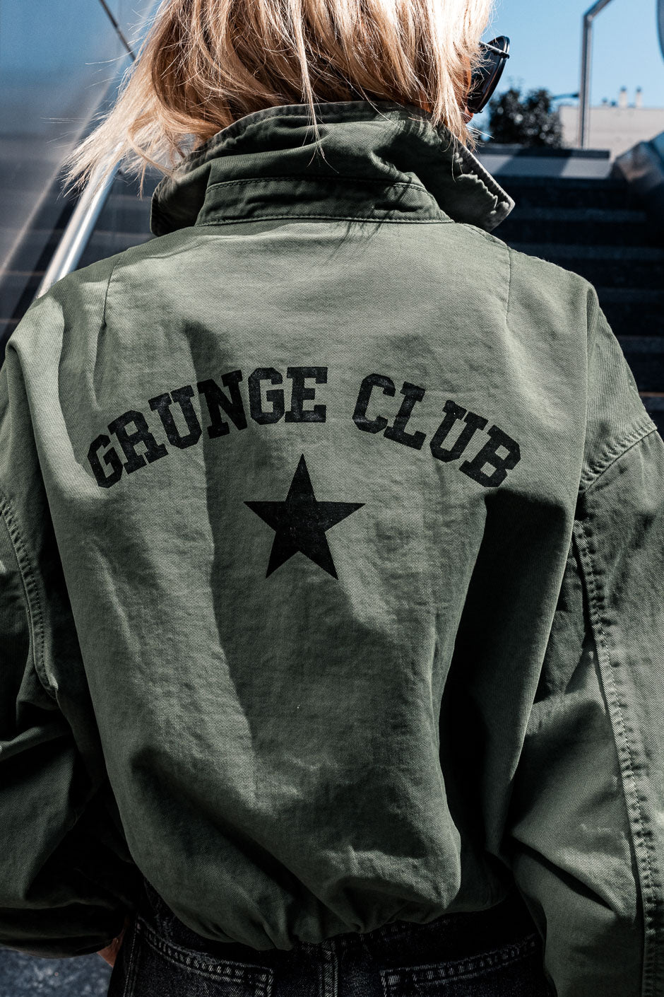 Blouson GALA kaki au style casual et affirmé, avec son print "GRUNGE CLUB" au dos. Ses manches effet ballon et sa coupe légèrement bouffante apportent du volume, tandis que sa matière 100% coton assure confort au quotidien.