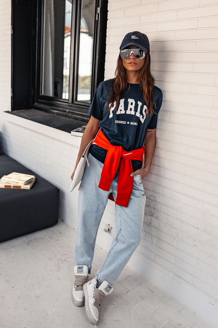 Décliné en marine foncé, le T-shirt Paris by Grungemama séduit par son coton ultra-doux et son allure effortless. Associé à un jean ou à un pantalon city, il compose un look casual chic, contemporain et affirmé.